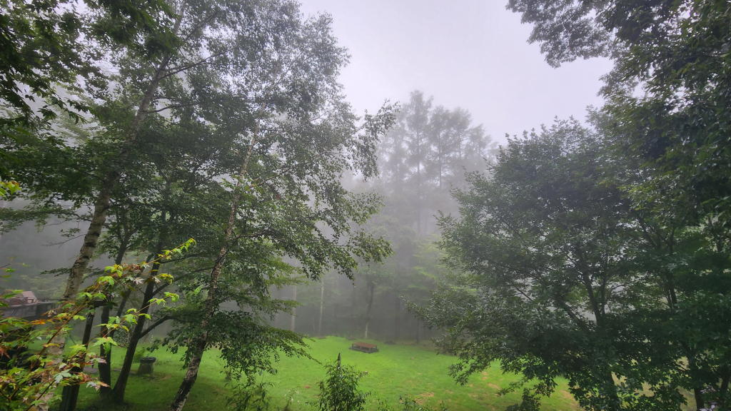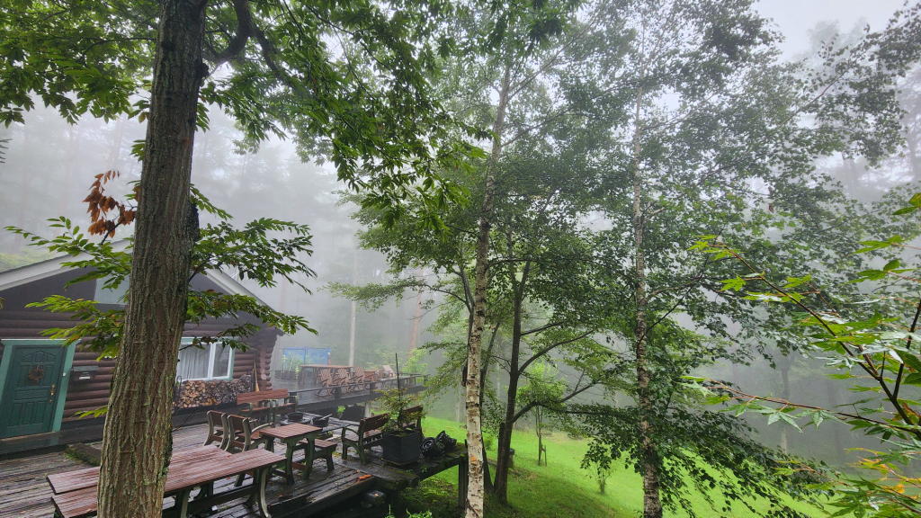 敷地内は「霧」に覆われていた。八ヶ岳で久し振りに体験する「霧の朝」である。
