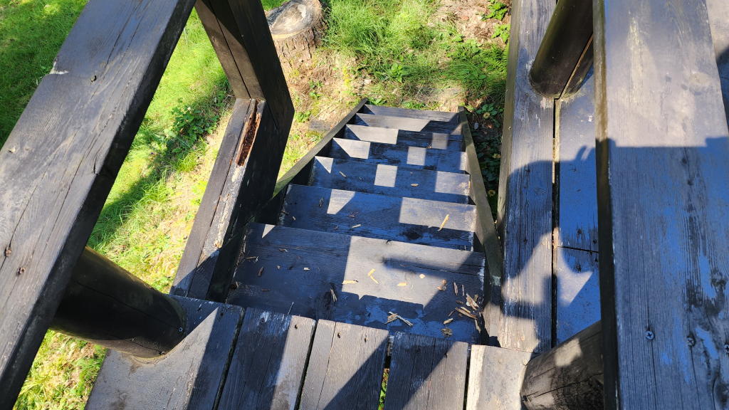 さあ今日は、昨日、キツツキ被害を発見したメインウッドデッキの階段部分の補修作業の日である。