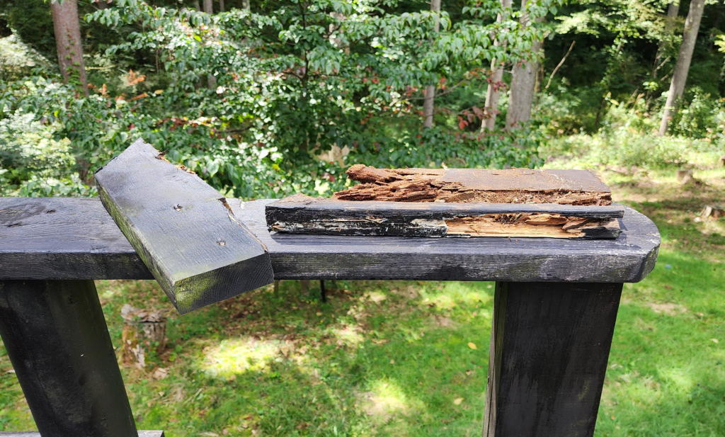 実は、被害を受けた部分は、ウッドデッキの強度には関係のない、まあ「見映えのための飾り」のような部分。