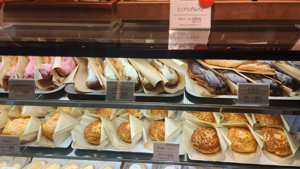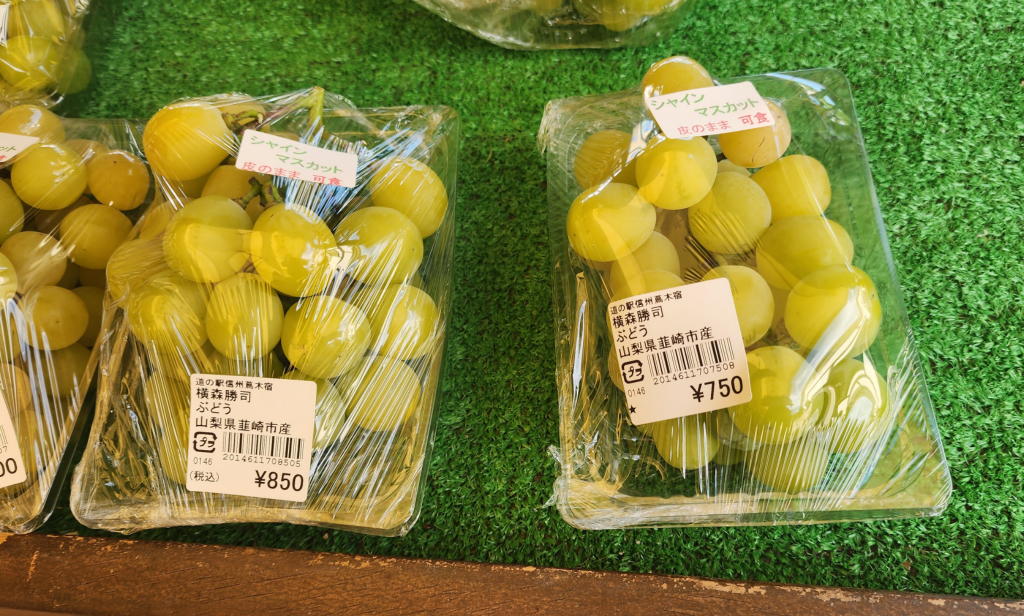 桔梗屋さんでジャンボエクレアを買って、道の駅「信州蔦木宿」の野菜直売所でシャインマスカットや地元の野菜を購入。