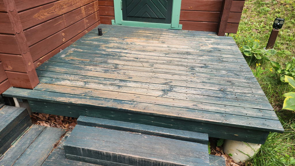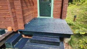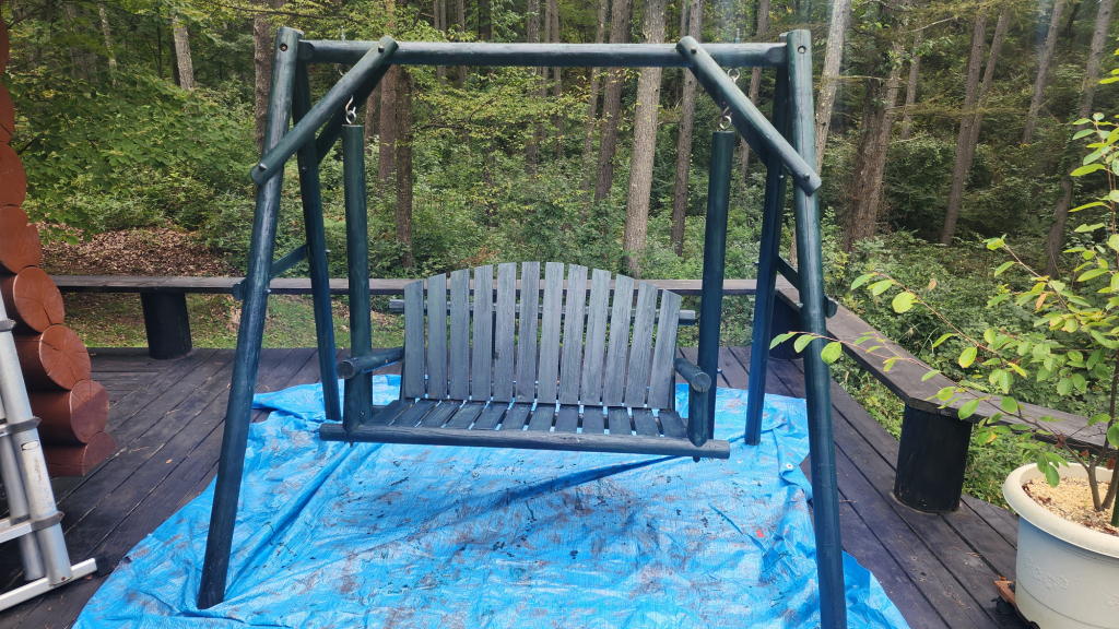 結局、オフィスエントランスだけでなく、本宅のドアとメインウッドデッキに置いたブランコも塗装することになった。