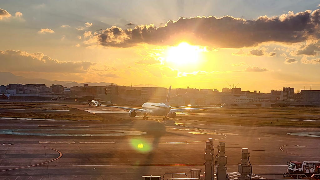 講演を終えた後、福岡空港のラウンジで見た夕陽は美しかったな…