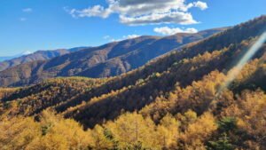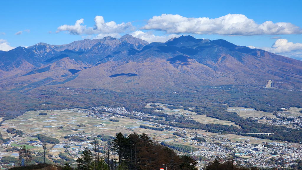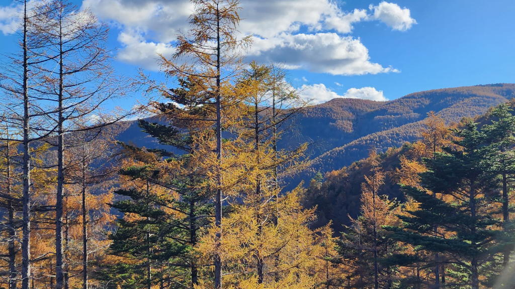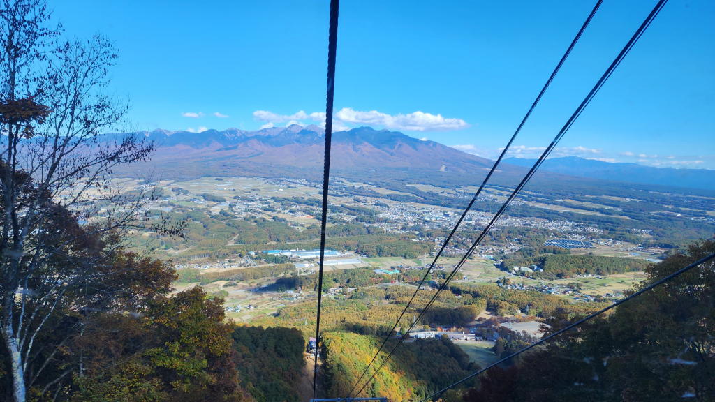 ゴンドラ車中では、八ヶ岳とその麓に広がる富士見の町を遠望し、既に黄金のシャワーを散らし始めた唐松林の絶景を堪能。