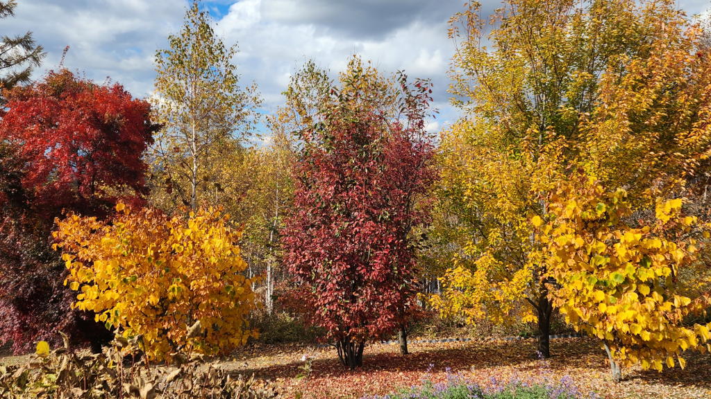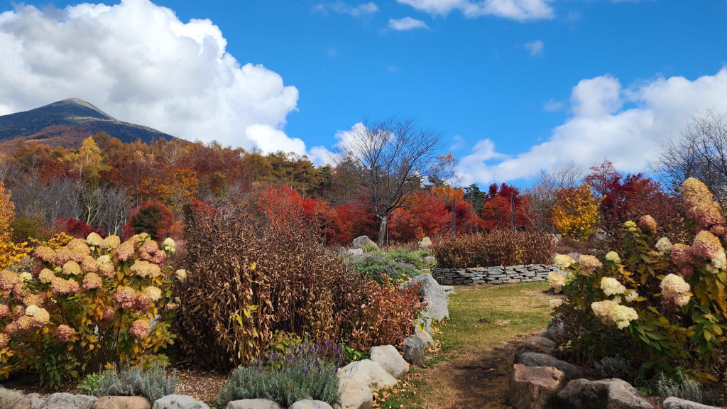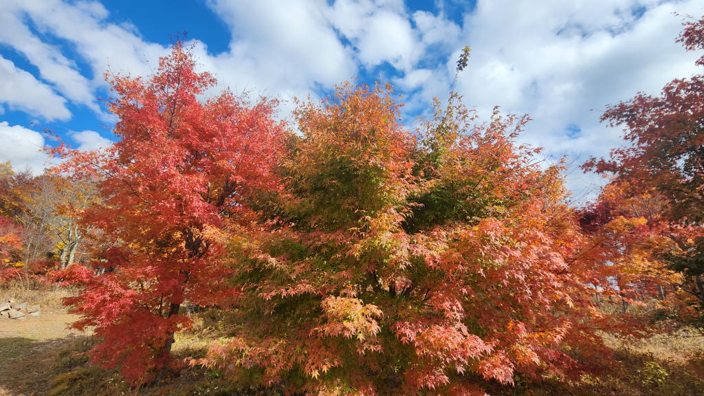 八ヶ岳ブルーの空は前回の方が美しかったけれど、紅葉が青い空に浮かんでいる白い雲に映えて、お洒落だったな…