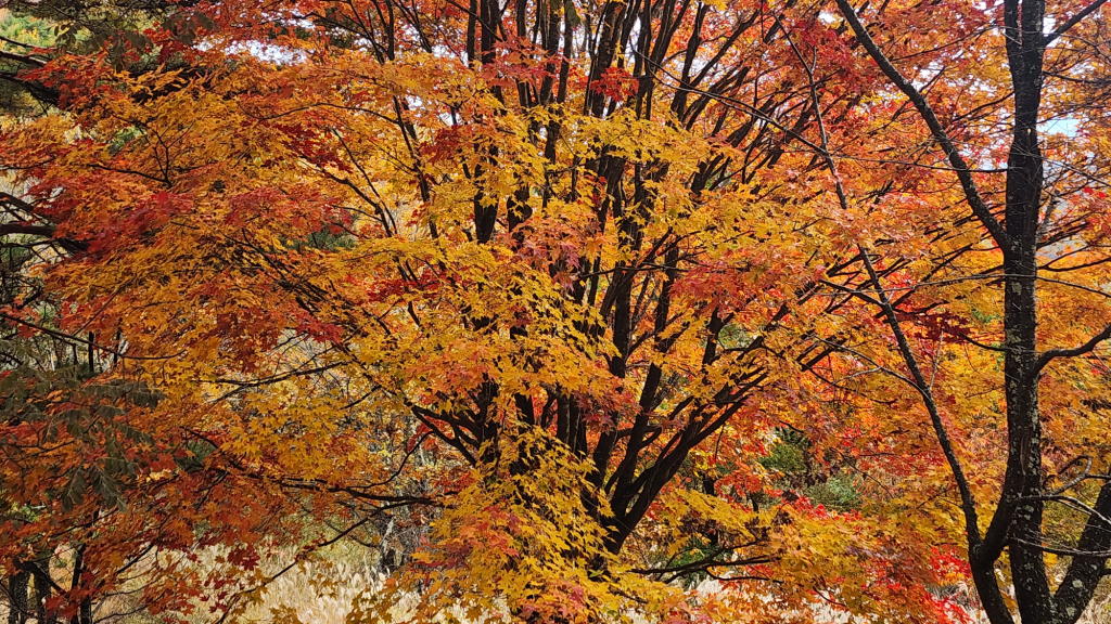 紅葉って「楓」だけってのも艶やかで美しいが、多様な樹種が様々な色で自己主張する光景も素晴らしいよね!