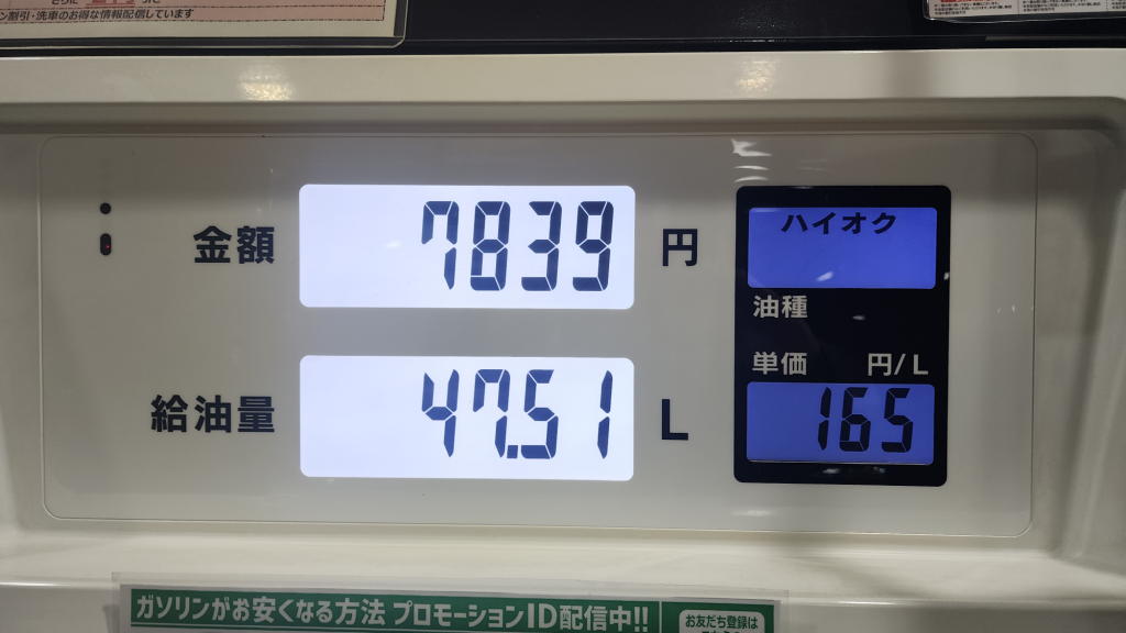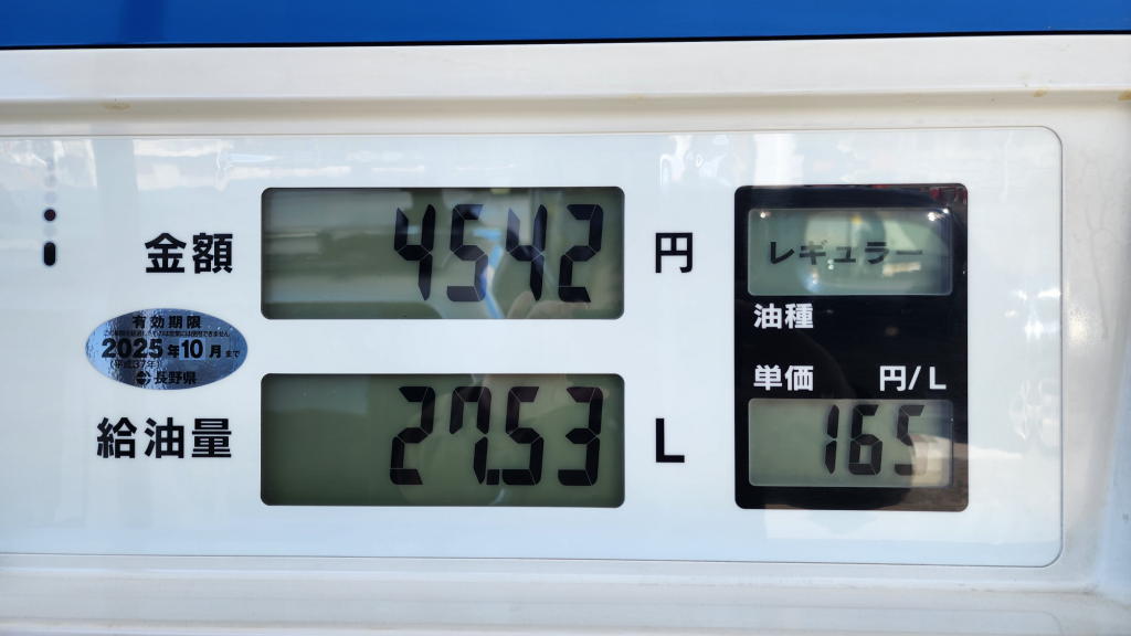 レギュラーガソリンがリッターで165円ね。あれっ? 165円??