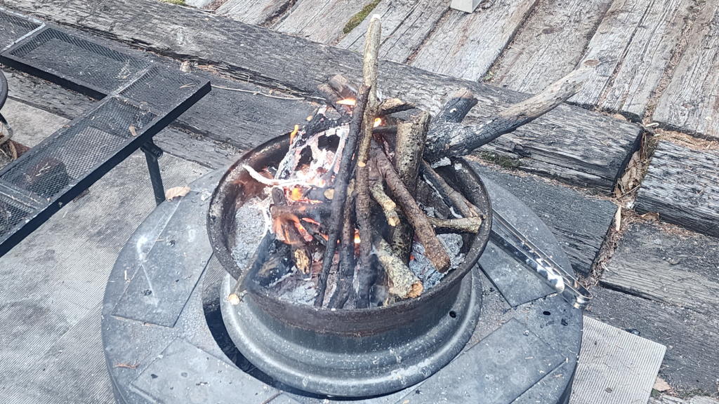 作業後、今日は敷地内に落ちていた小枝で「焚き火」を楽しんだ。