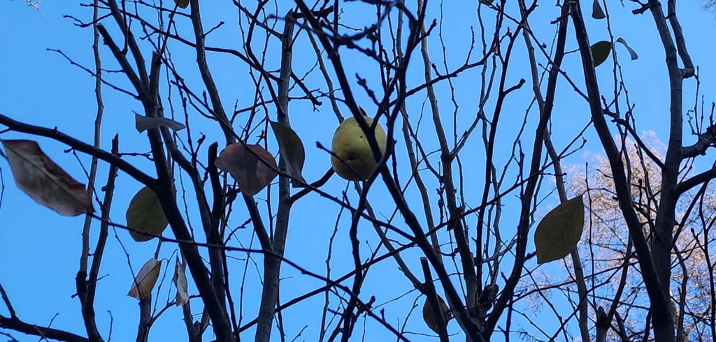 昨日の朝、出社した時点でカリンの葉の残りは10枚もなかった。そして枝に残った実もわずか1個。