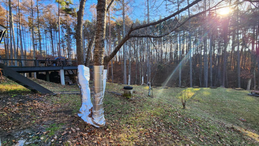 昨日の午後2時過ぎから、私はガーデンファニチャーのオフィス地下室への収納などの作業、社主さまは、毎年恒例の庭木への「鹿除け銀マット巻き」から開始。