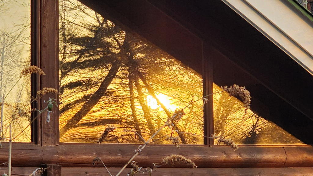 いきなり目に飛び込んできたのは、本宅の三角窓に映り込んだ美しい夕陽であった。