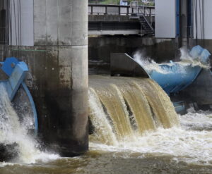 折からの強風で諏訪湖は波立っており、水門の周辺は荒れて「迫力の光景」。