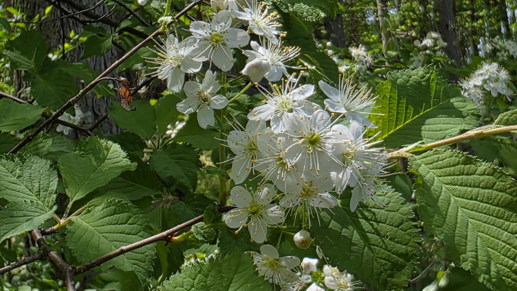 敷地東側のシンボルツリー「リョウブ」の様子を見に行ったら、その脇に自生している「ミヤマザクラ」の開花が始まった事に気が付いた。