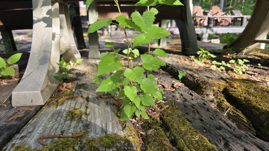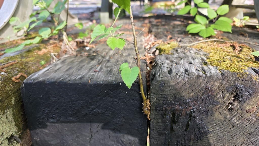 さらに自生している白樺がないか探してみると、枕木テラスの細い隙間に根付いているのを2本発見。
