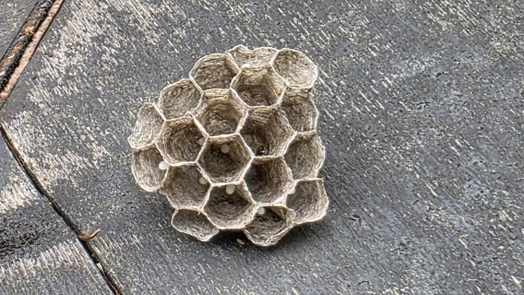 庭の散策を終えて、オフィスのウッドデッキで軽作業をしていたら、作り始めたばかりの「アシナガバチ」の巣を発見。