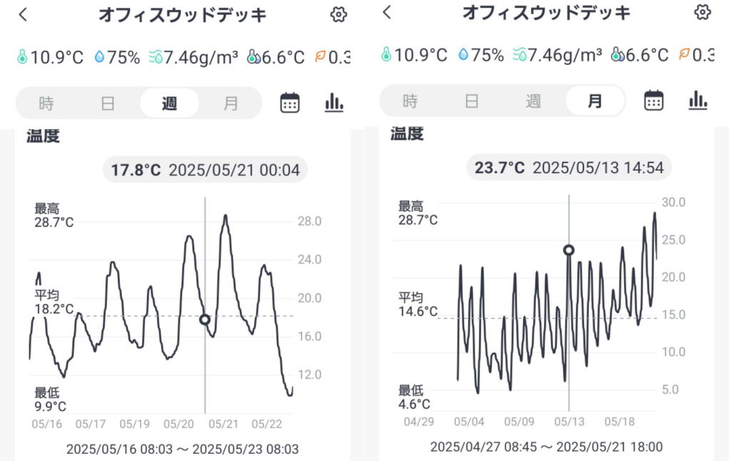 オフィスのウッドデッキに設置した温湿度モニターのデータを確認したら、今朝の最低気温は9.9℃と10℃を割り込んでいた。