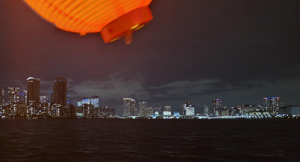 屋形船に戻って、船内から夜景を撮影していると、いきなり視界に「赤い物体」が飛び込んできた。