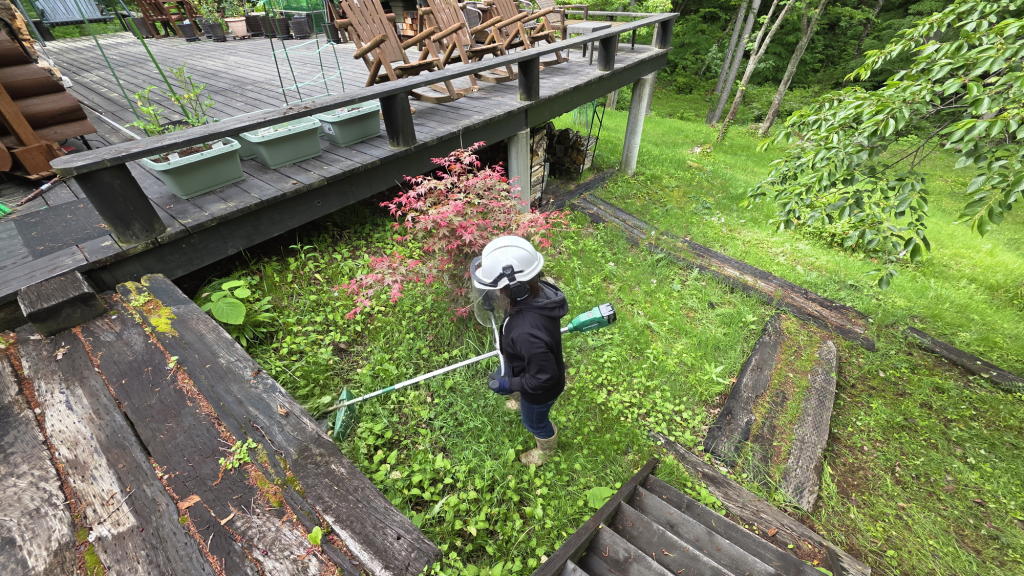 彼女専用のバッテリータイプの草刈機で軽やかに草刈り作業を進めて行った。