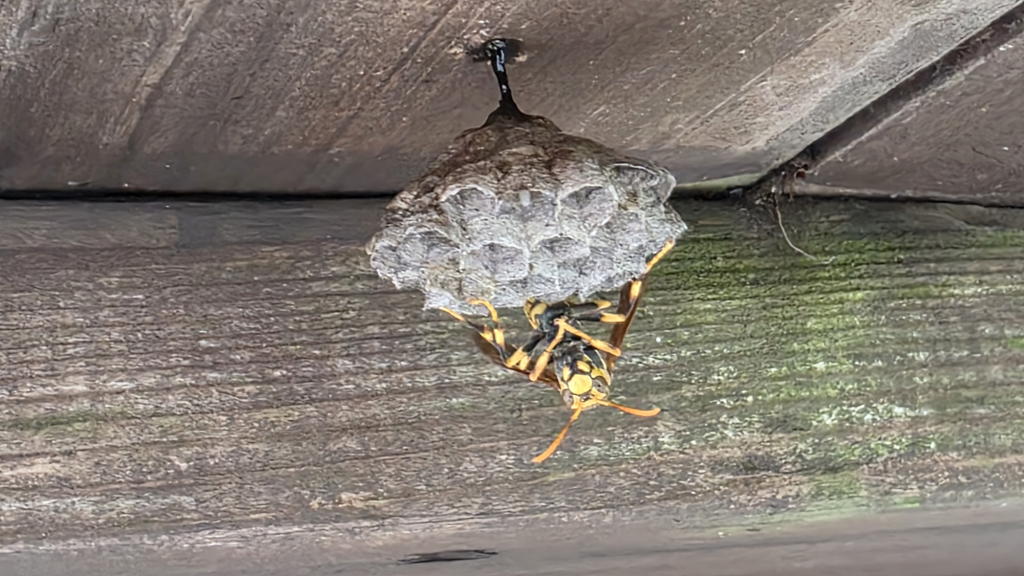 テーブル下を除いたらアシナガバチが巣を作り始めていた。