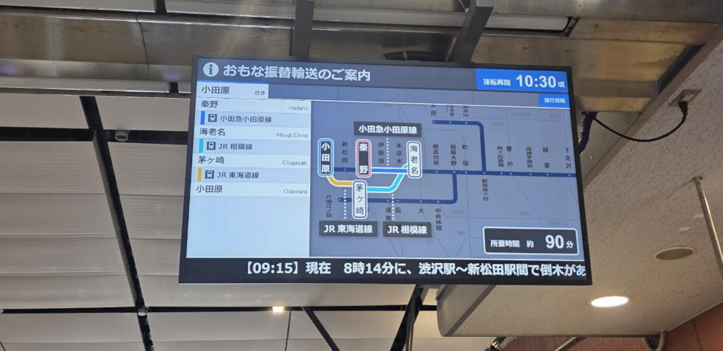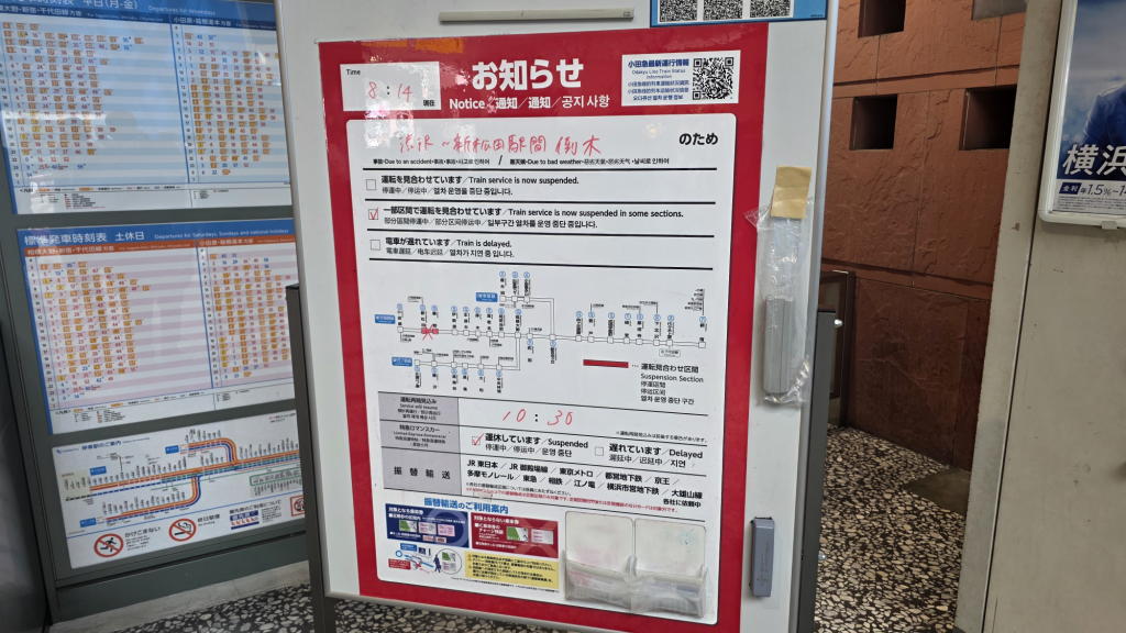 小田原への代替交通手段を駅員さんに尋ねると、JRでの代替輸送の所要時間は約90分。