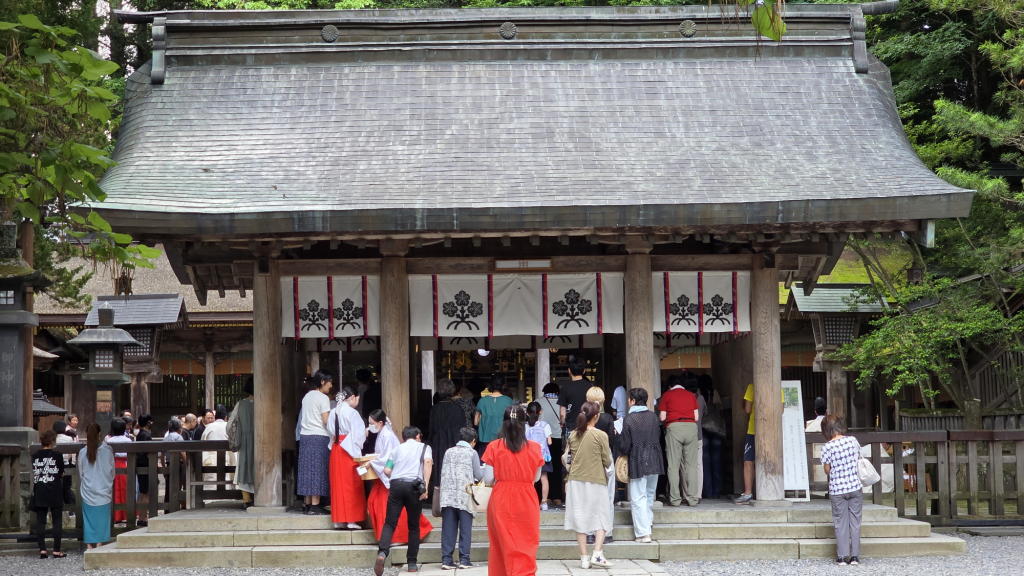 ちょうど、神職の方々が大祓式の片付けをしているところで、本殿前の広大なスペースは、参拝者は私達を含めても数名であった。