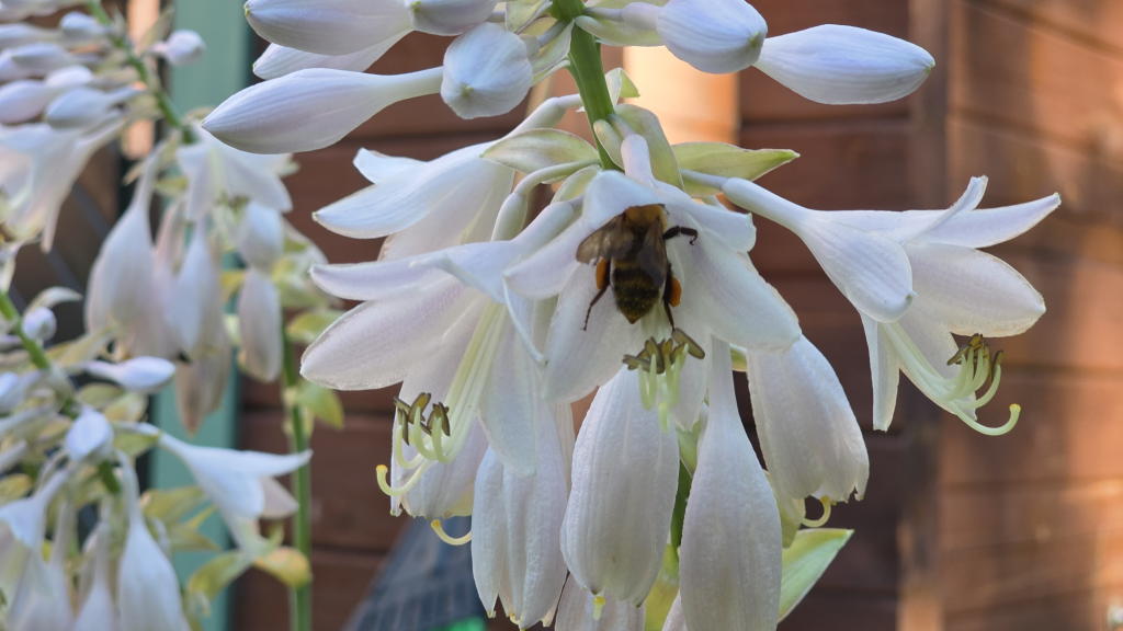 約30種類あるホスタさん達の様々な花に潜り込んで、真面目に蜜を集める蜜蜂さん達を見ていると、何となく幸せな気分になってくる。