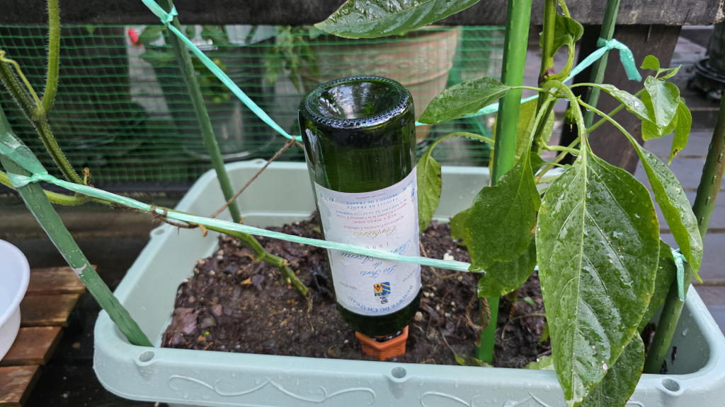 プランターの土にテラコッタの給水器を差し込んで、水をいっぱいに満たしたワインボトルを差し込むだけ。