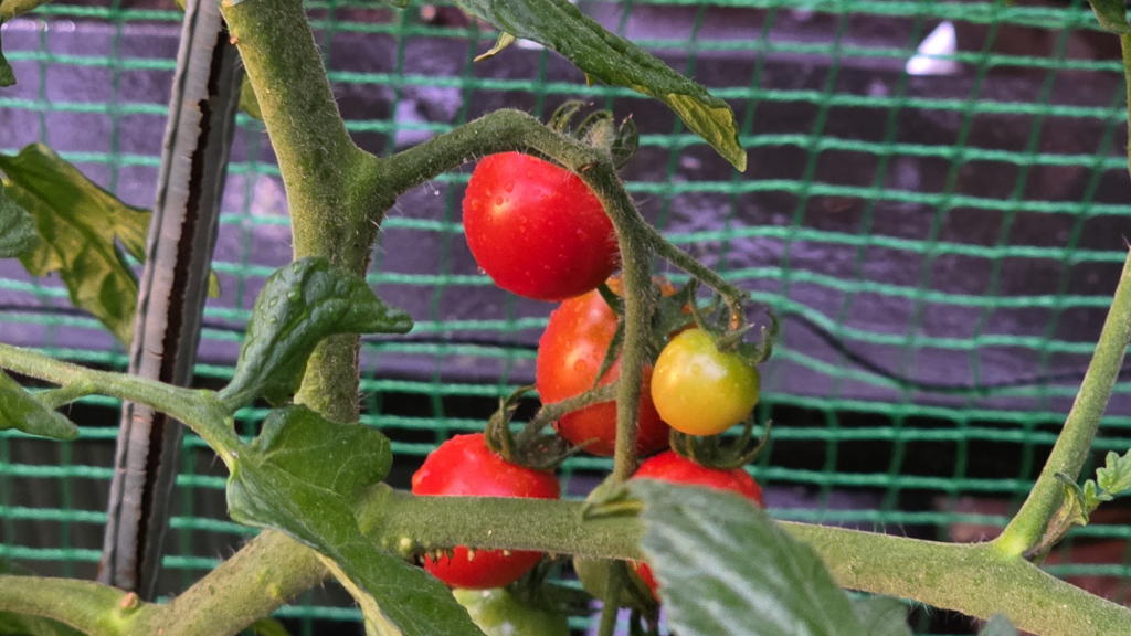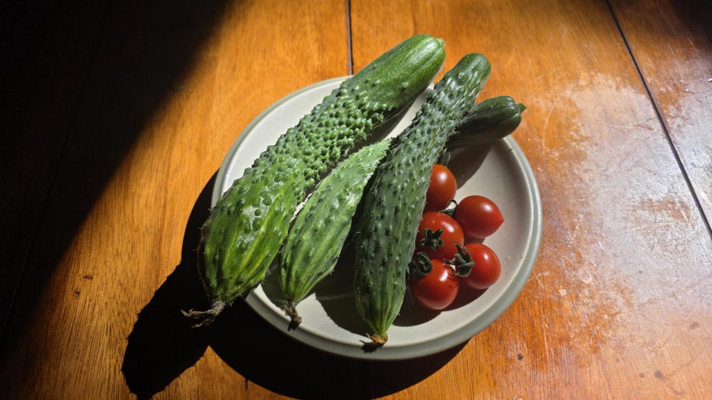 水遣り作業を終えて、今朝のキュウリやトマトを収穫。
