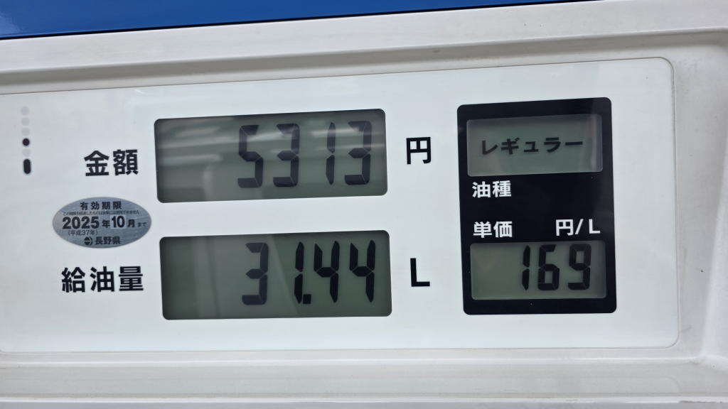7日に、茅野でミニパジェくんの給油をENEOSのGSでした際には、レギュラーがリッターで169円。