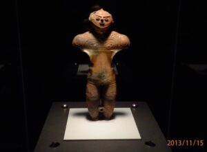 文化交流センターの方の解説によると、この土偶の名前は「茅空(かっくう)」というのだそうだ。以前、学術的MRI検査を受ける際には女性として診察券が発行されたとのことなので「かっくうちゃん」である。約3,300年前の土偶で、国宝であるにもかかわらず、文化交流センターに常設展示されるまでは「町役場の金庫」に保管されていたとの事。