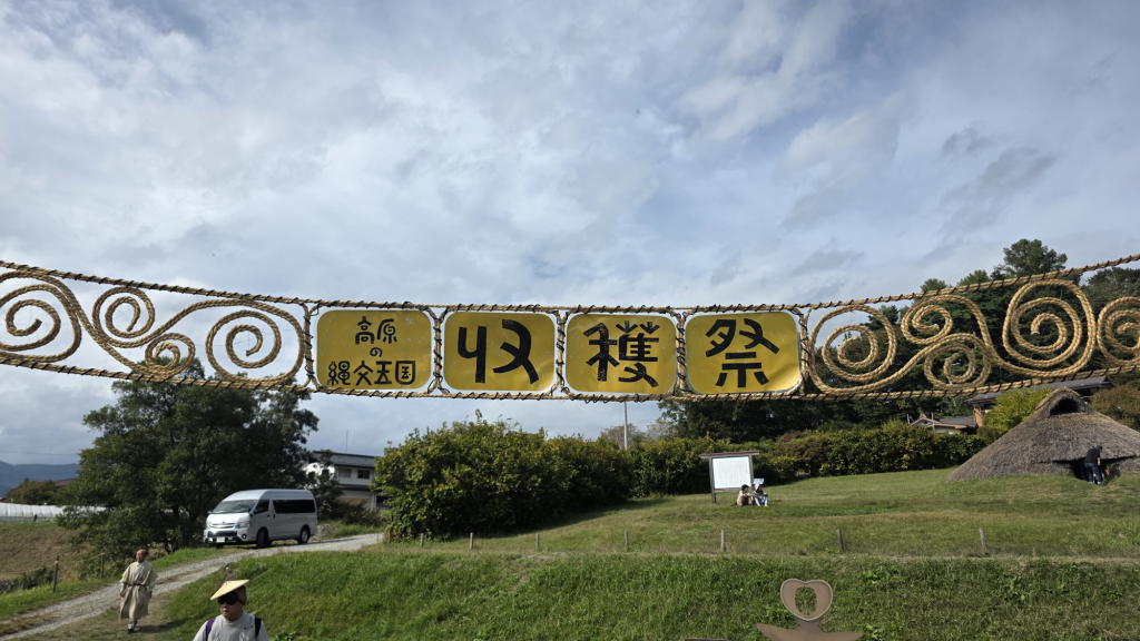 おとちゃんを停車して、復元住居の方を見上げたら「高原の縄文王国 収穫祭」開催中であった。