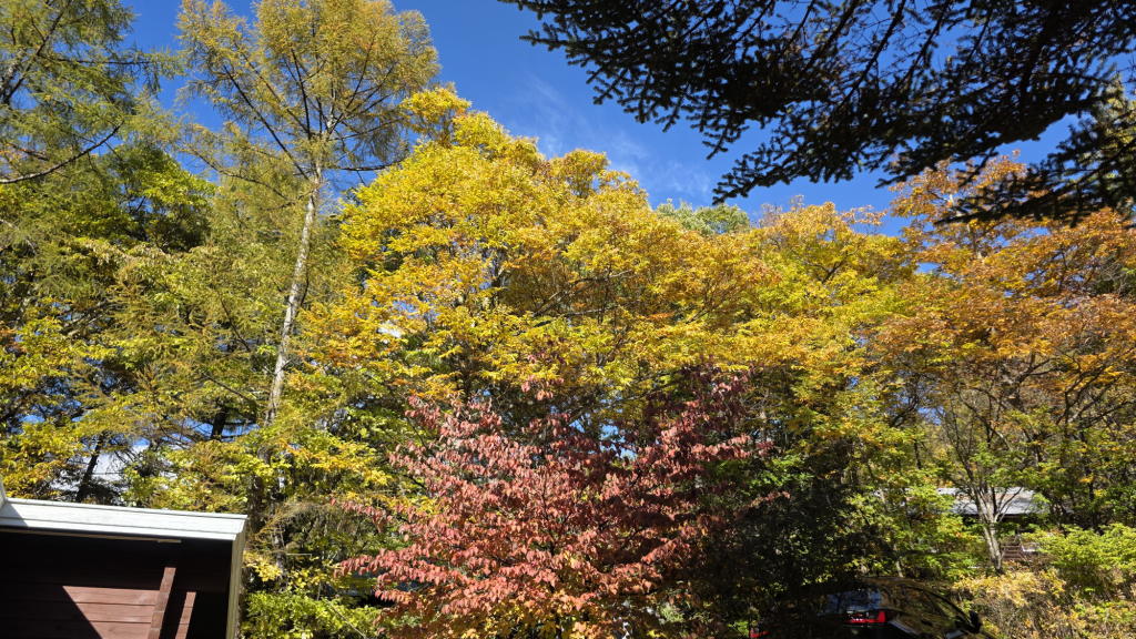 昨日の雨のせいか、我が家の敷地内の黄葉も一気に進み、八ヶ岳ブルーの空とのコントラストが美しい。