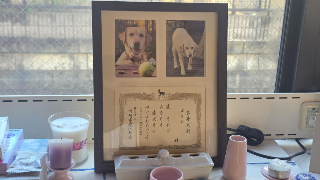 遺影の額の下部には、川崎市獣医師会から送られた「長寿犬彰」が飾ってあるのだ。