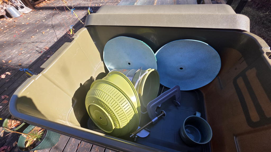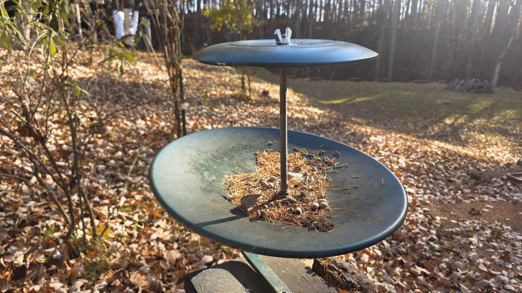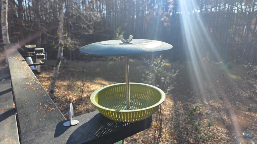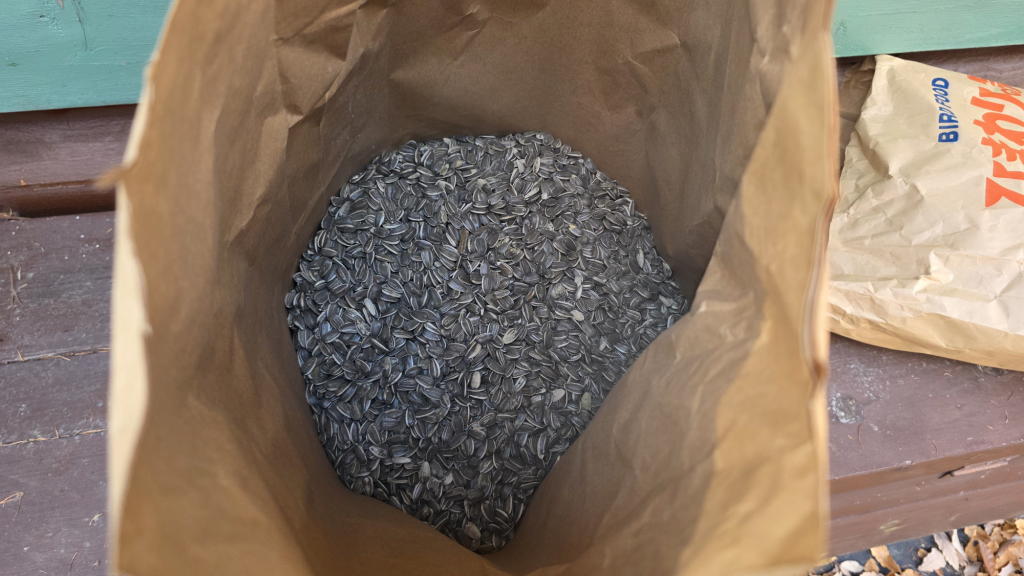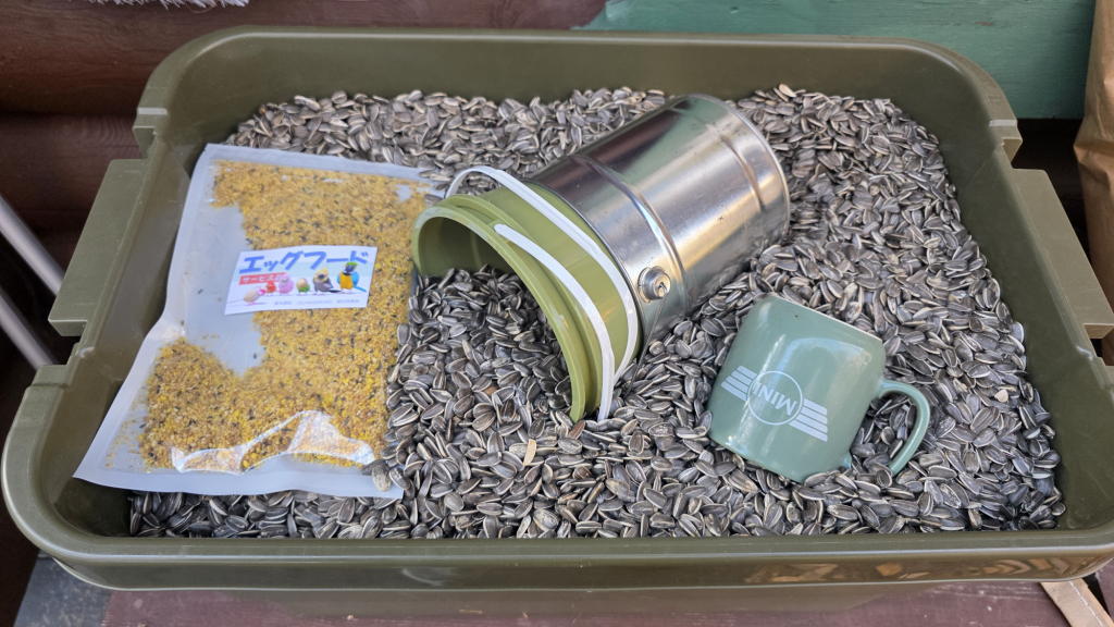 エーイ、ついでだからヒマワリの種をストッカーに入れて、給餌台の準備も済ませてしまおう。