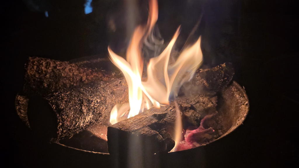 ウラジロモミの枝の残材は日の入り後も、焚き火台の中で静かに燃え続けた。