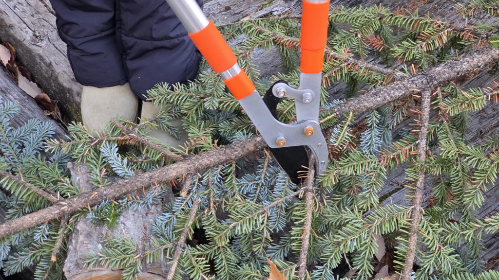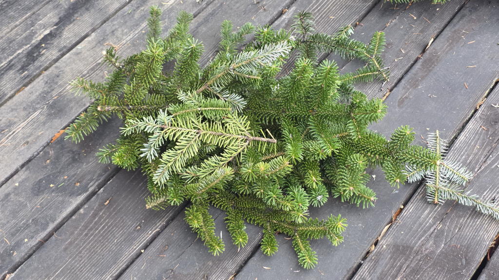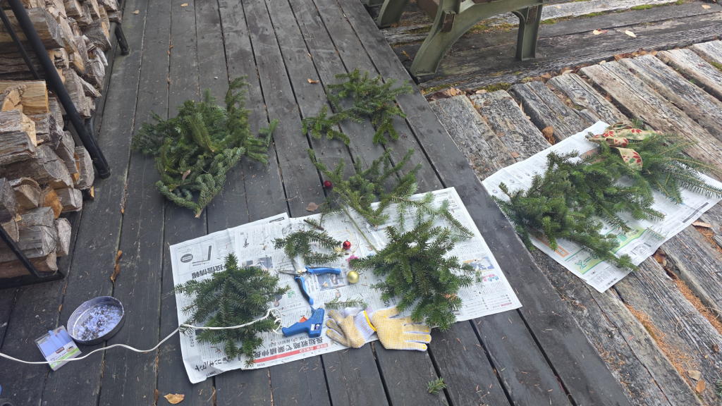 枝切り鋏や彼女用の小型の電動チェンソーを器用に使い、どんどんリースやスワッグ用に切り分けていった。
