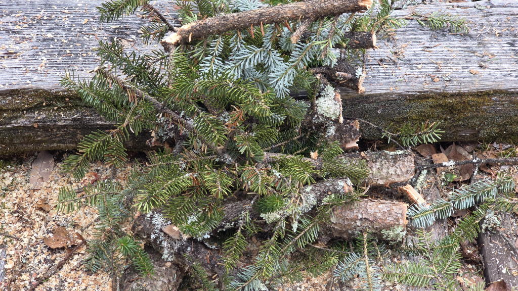 昨日、伐採したウラジロモミの枝もリース作り等に使用しない部分はチェンソーで細かく切って、さっそく「焚き火」が始まった。