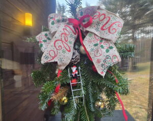 本宅とオフィスのドアには、伐採したウラジロモミさんの枝や敷地内で拾い集めた松ぼっくりを使って、社主さまがササッと作り上げたスワッグが掛かっている。