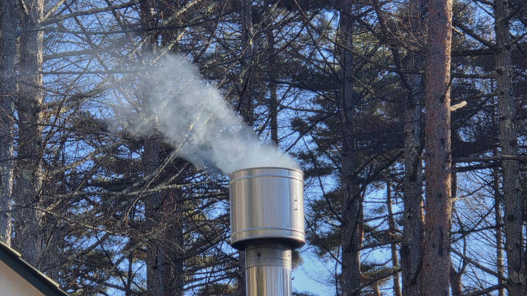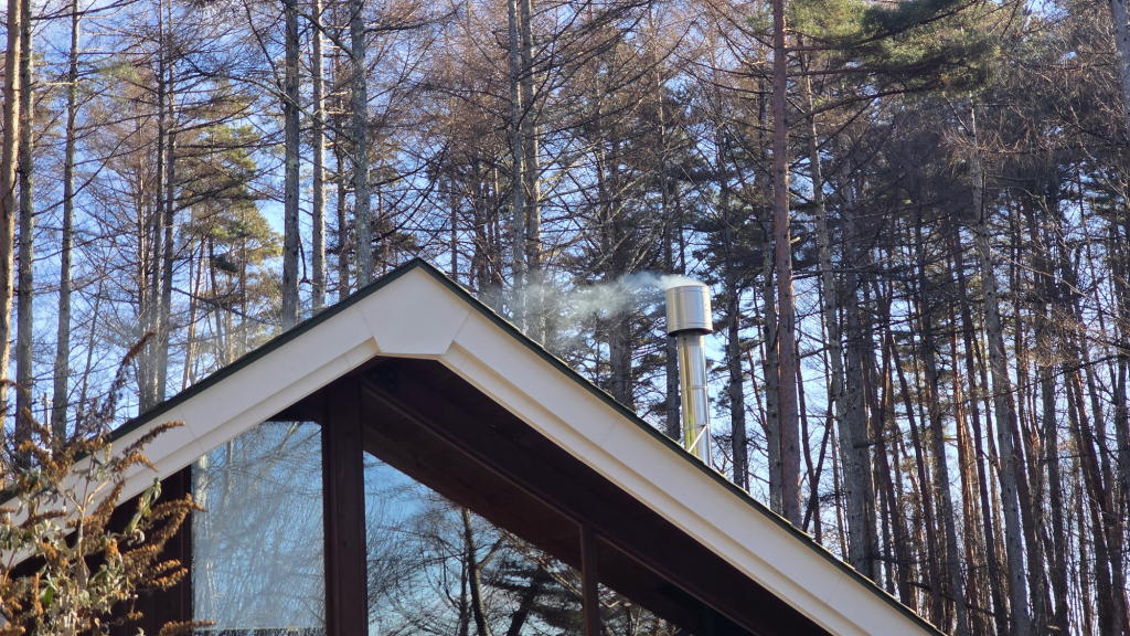 本宅の煙突からは、薪ストーブの煙がたなびく。