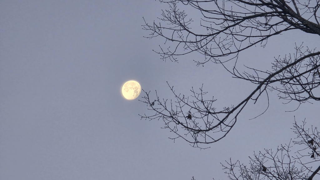 オフィスの上空には、ウルフムーンを過ぎたばかりの「有明の月」。美しいね…