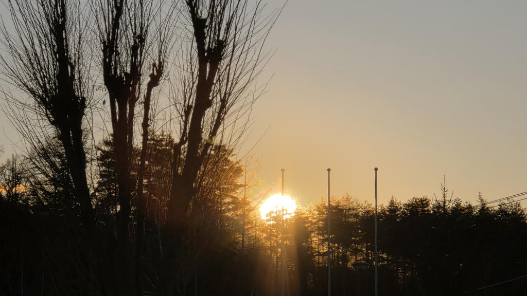 河口湖周辺は、ちょうど日の出時刻。朝陽が上る美しい光景の中、富士山にご挨拶。