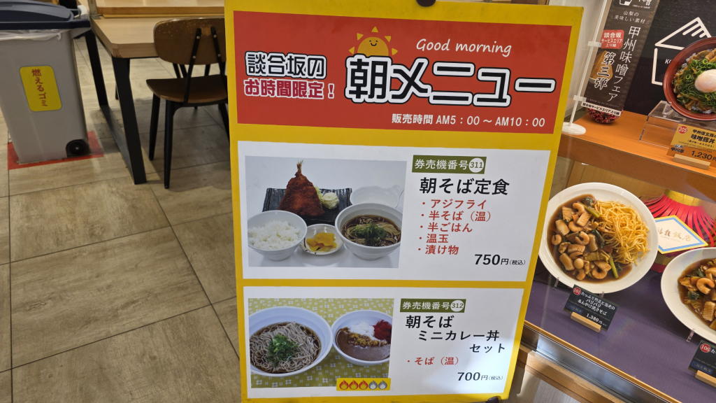 途中、談合坂SAに立ち寄って、上りSAの名物「朝定食セット」を味わう。