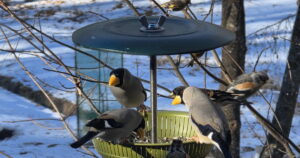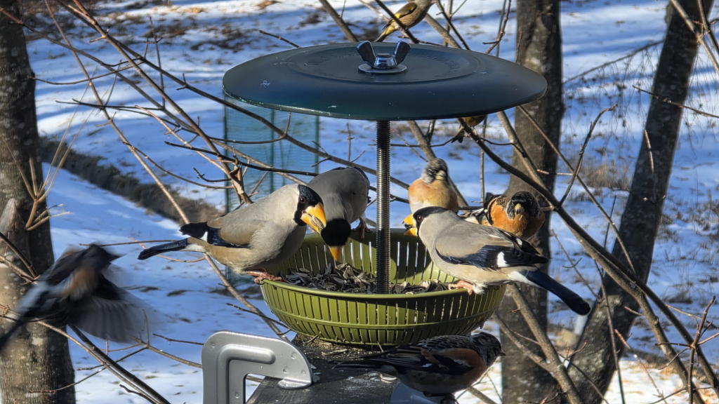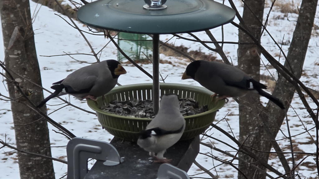 スゴンに視線を転じると、またイカル軍団がやって来て、ヒマワリの種の奪い合いをしていた。