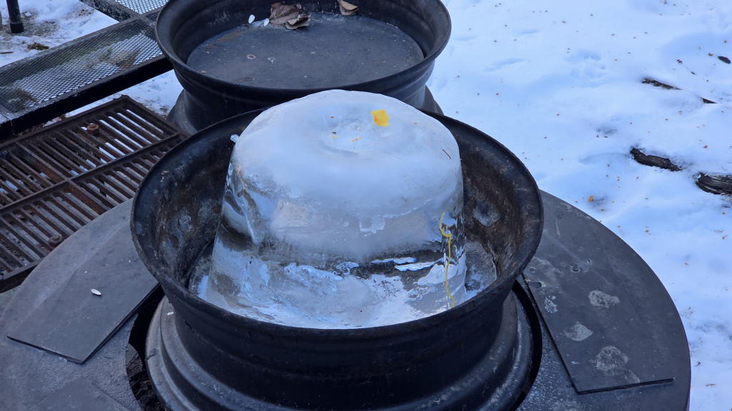 焚き火台に置いてキャンドルを楽しんだ氷の山も、当然ながらまだ溶けずに山形をしっかりと保っている。