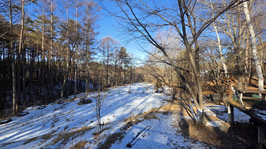 お庭のフラットスペースとテニスコートには、数日前に積もった雪がまだ薄らと残っていて、これがまた風情がある。