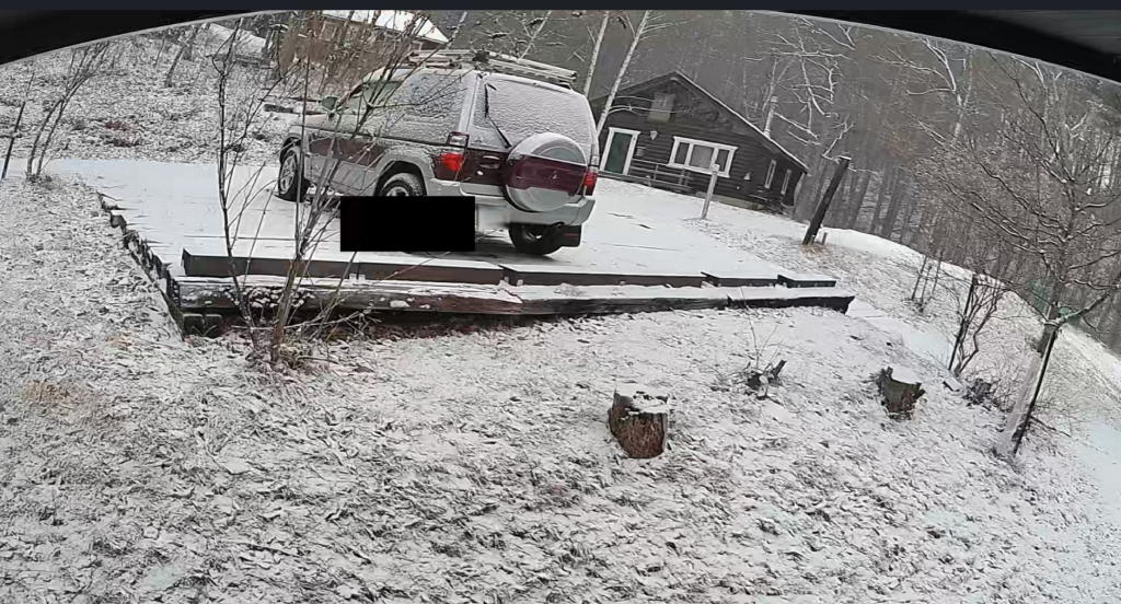 枕木駐車場でお留守番役のミニパジェくんを映す画像の積雪量はどう見ても1~2cm。