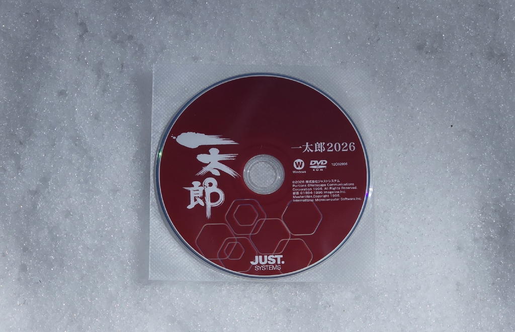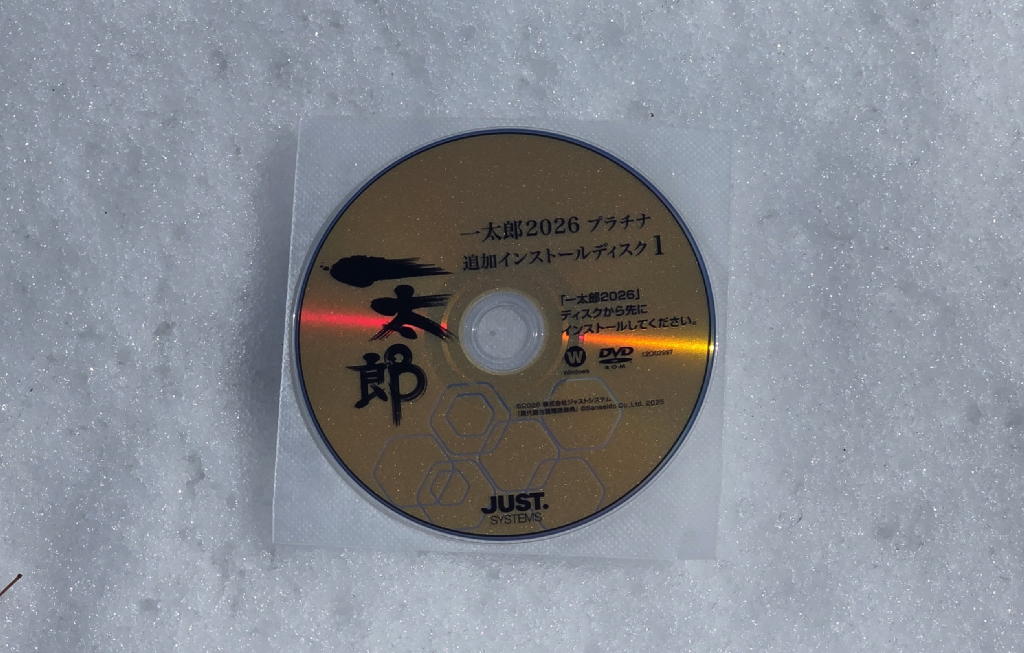恒例の儀式とは、毎年2月初旬にバージョンアップされる日本語ワープロソフト「一太郎」の真っ赤なDVD-ROMを真っ白な雪の上に置いて「日の丸写真」を撮影すること。