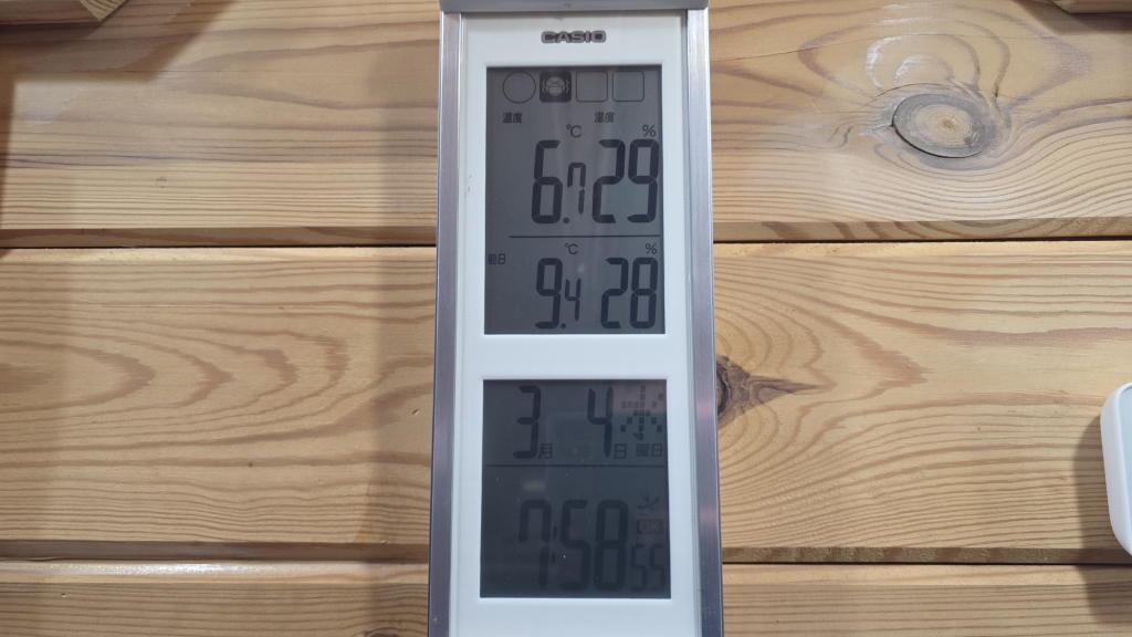 調温調湿機能に優れたログハウスといえども、さすがに真冬に2週間近く閉めきったままのオフィスの室温は6.7°まで低下し、湿度は29%とカラッカラ状態。