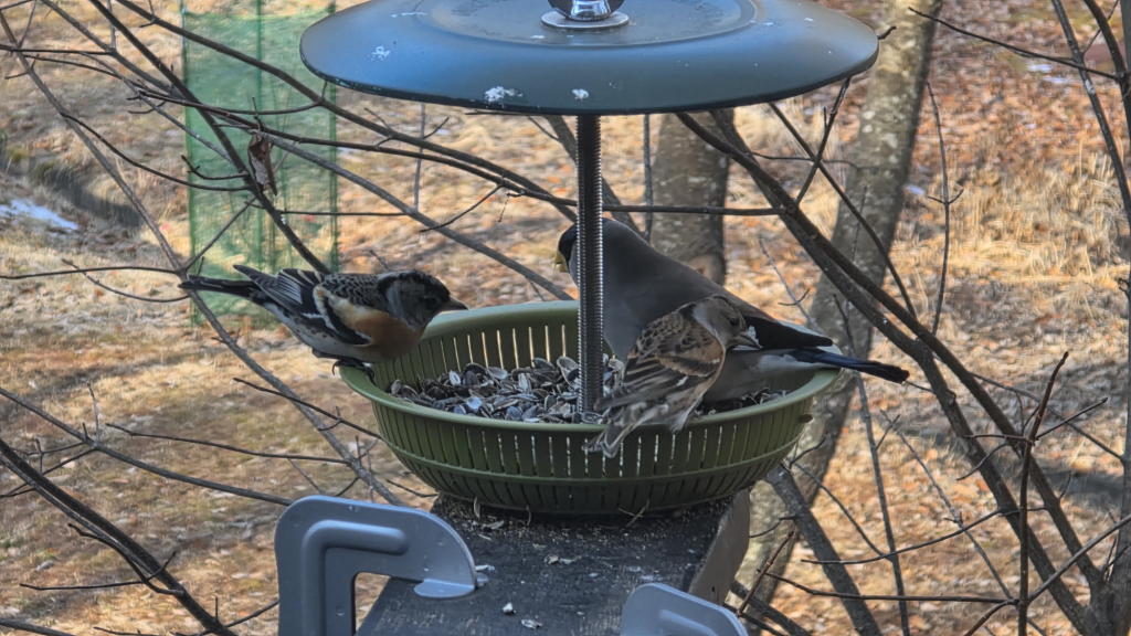 オフィスに戻って数分すると、地震直前に一斉に飛び立って逃げた野鳥さん達が給餌台に集まってきた。