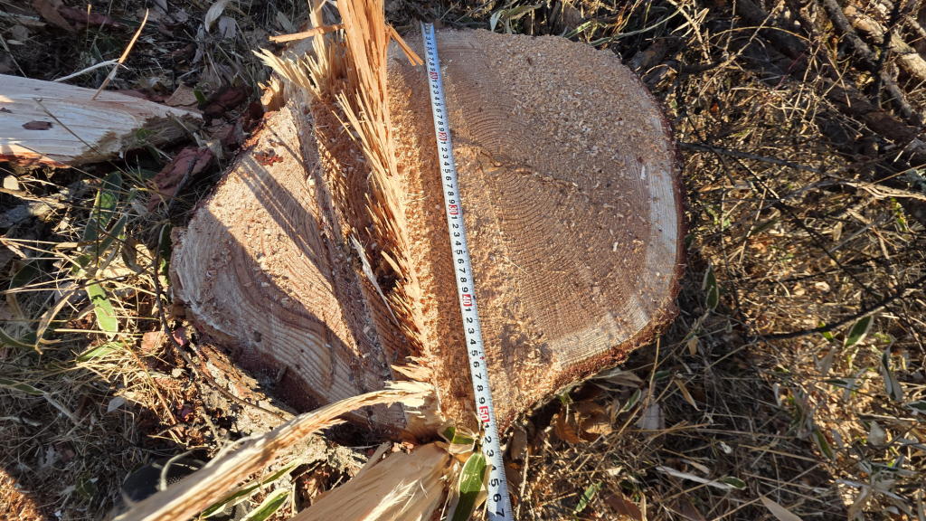 昨日から、直径40~50cm、樹高15~20m程度の唐松や赤松の伐採作業が本格化。