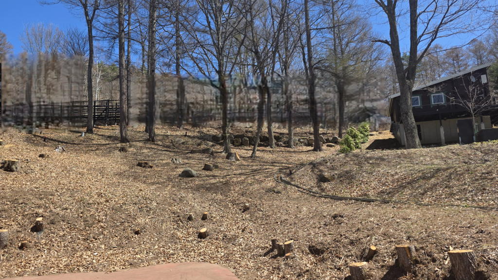 今回、赤松、唐松を中心にかなり思い切った樹木の伐採を行った。